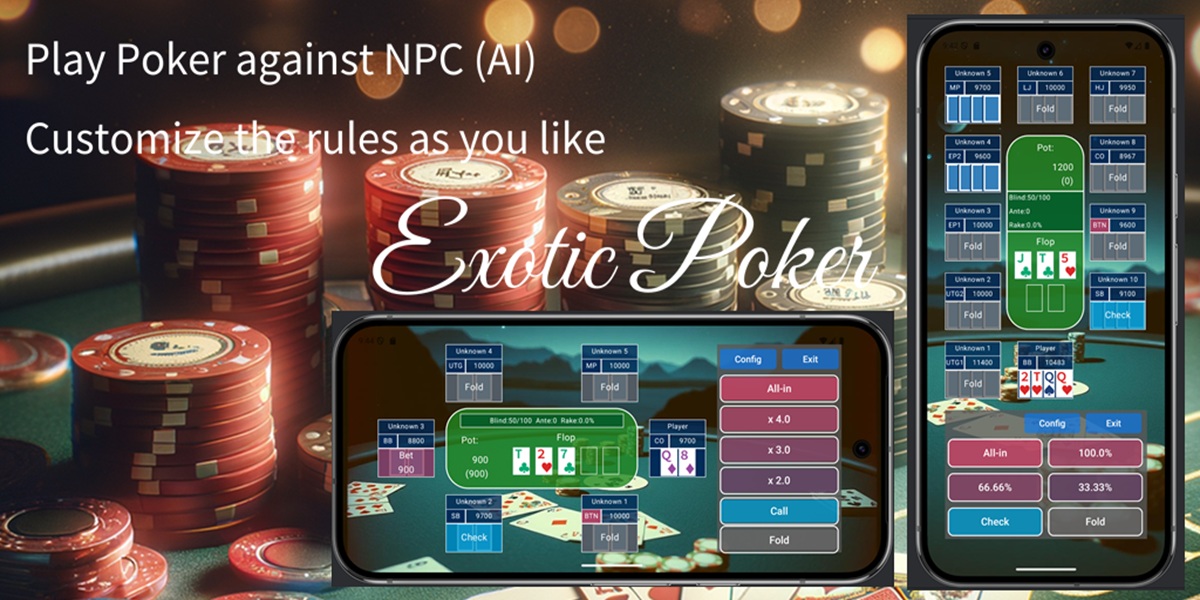 The name of the game, “Exotic Poker,” comes from the term “Exotic Derivatives,” which refers to derivative transactions of financial products that have customized and complex contractual clauses. We call the game “Exotic Poker”, because it’s a game where you can play poker with customized and complex rules.