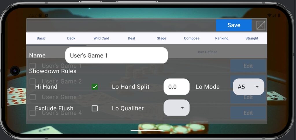 This game allows you to edit the rules applied to poker and play with the edited rules. The settings are organized across the following 8 screens.