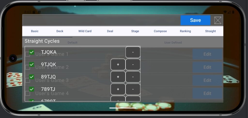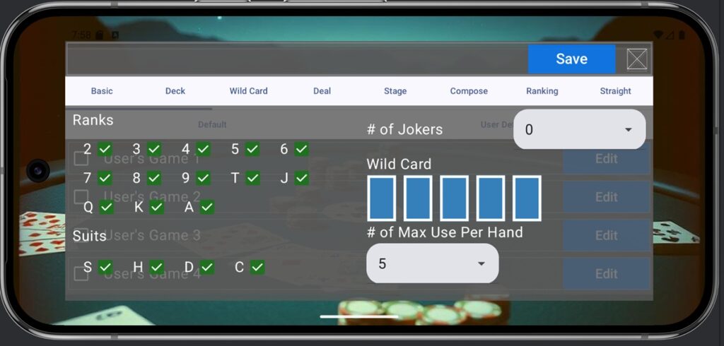 - Wild Card: Specifies which cards act as Wild Cards. Jokers are always treated as Wild Cards. Up to 5 different card types can be set as Wild Cards.