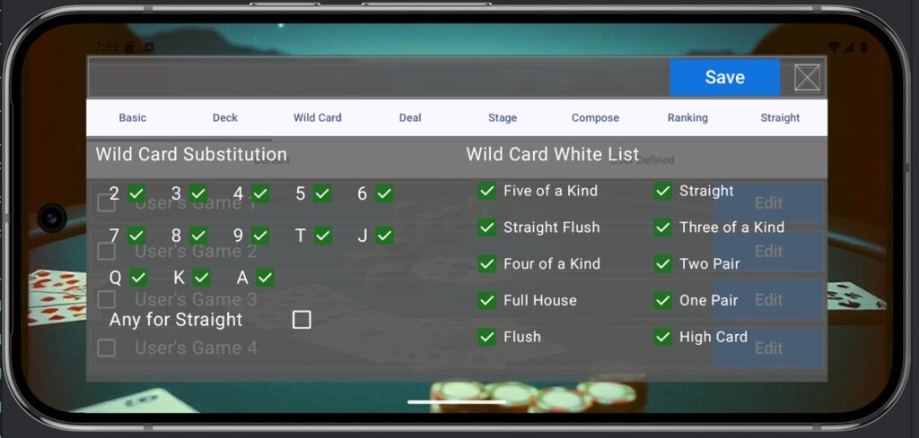 - Wild Card Substitution: Specifies the ranks the wild card can substitute for. For example, if only A can be substituted (like Joker as a Bug) or if it can substitute for any rank in a Straight, check only A and check Any for Straight.