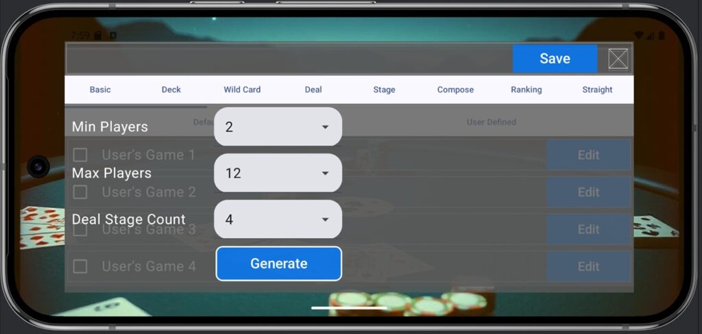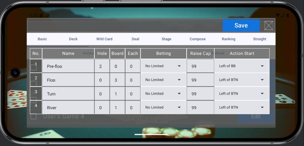 - Deal Stage Count: Specifies the number of betting rounds. For Texas Hold’em, this is 4.