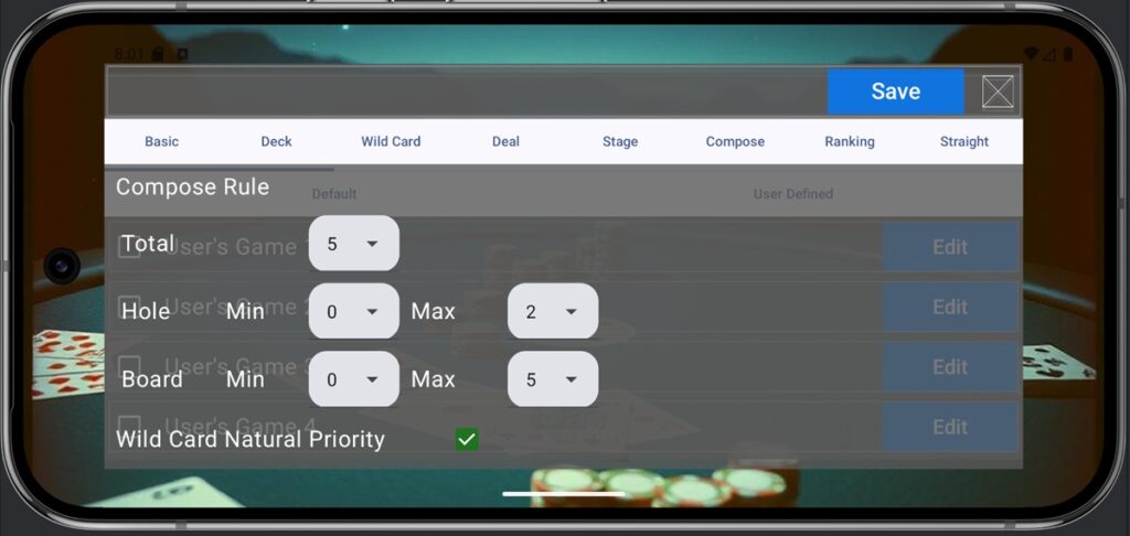 - Compose: Sets the rules for composing hands and community cards during poker hand evaluation