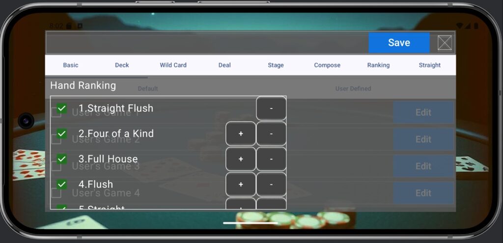 The Ranking screen allows you to set the strength of poker hands. For example, in Short Deck Hold’em, the strength of a Full House and a Flush is reversed, and this can be set here. The checkbox to the left of a hand name indicates whether that hand is valid. Use the + and – buttons to the right of a hand name to swap its ranking with the hand above or below it. You can scroll the screen by dragging. Specify the order for all hand rankings.